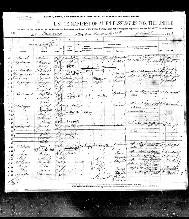 Joseph and Elizabeth Szillagyi came to the United States in 1907 aboard the Pannonia that departed from Fiume and arrived in New York. They arrived with their 3 children, Margaret, Joseph and Kalman, and had one more child later ; a daughter Rose who was born the United States.